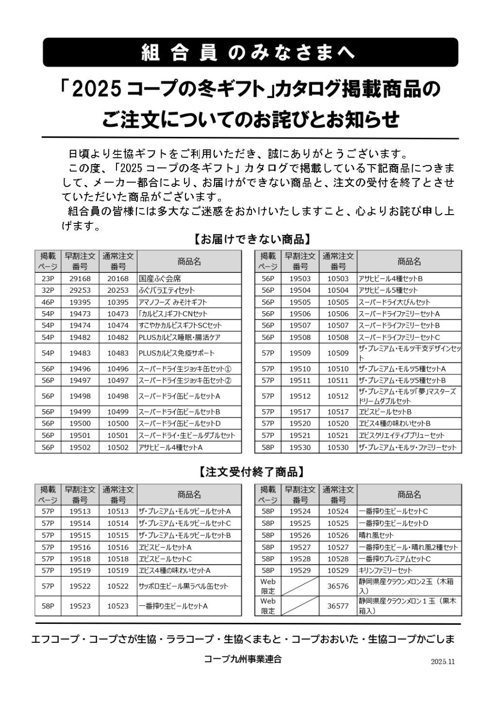 「2025コープの冬ギフト」カタログに掲載の商品におきまして、メーカー都合によりお届けができない商品と、注文の受け付けを終了させていただいた商品がございます。詳しくは下記をご覧ください。