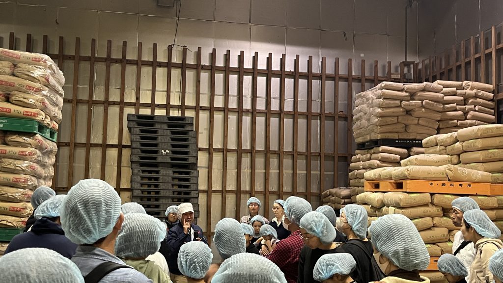 はじめに工場内の見学を行いました。異物や石、精米によって砕けたお米を機械やセンサーを使用して除去したり、ヌカ取りや計量、袋詰めをしたりと、最終チェックまでの各工程を順番に見て回りました。