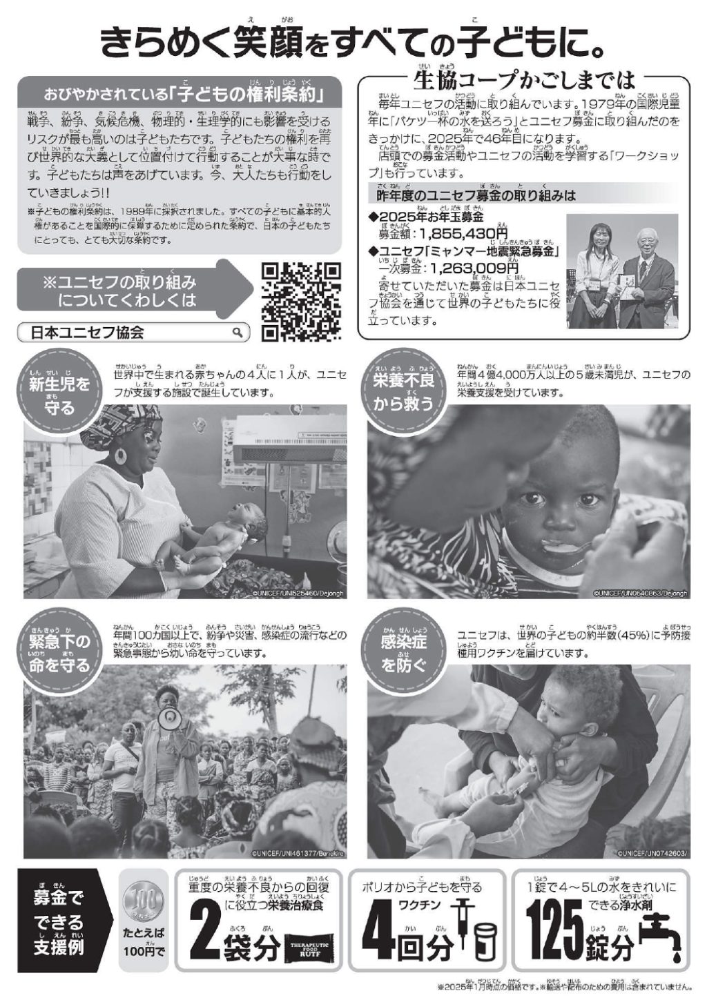生協コープかごしまでは、毎年1月に「ユニセフお年玉募金」に取り組んでいます。