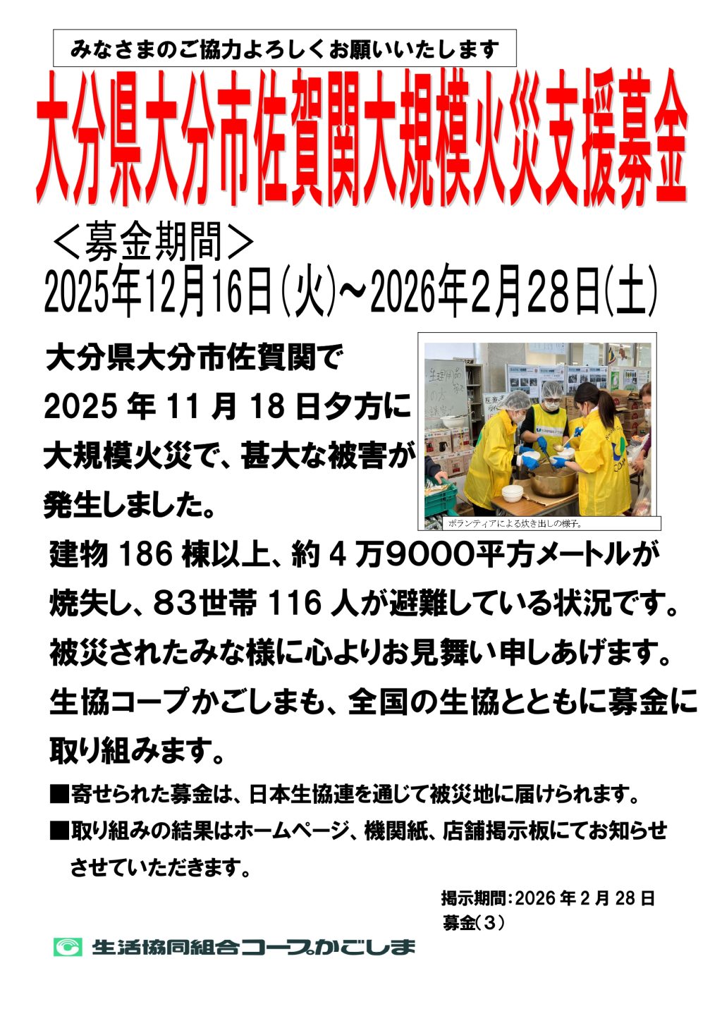 生協コープかごしまでは、11月に大分県で発生した大規模火災の被災地支援として「大分県大分市佐賀関大規模火災支援募金」に取り組みます。
