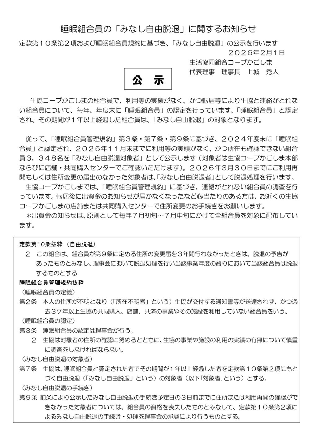 ≪公示≫睡眠組合員の「みなし自由脱退」に関するお知らせ