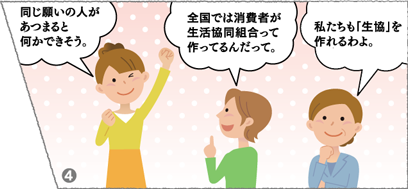 「くらしを守る消費者の会」が、自分たちの願いや思いを実現するためには、力を寄せ合うことを学び、「生協」づくりへと発展していきました。