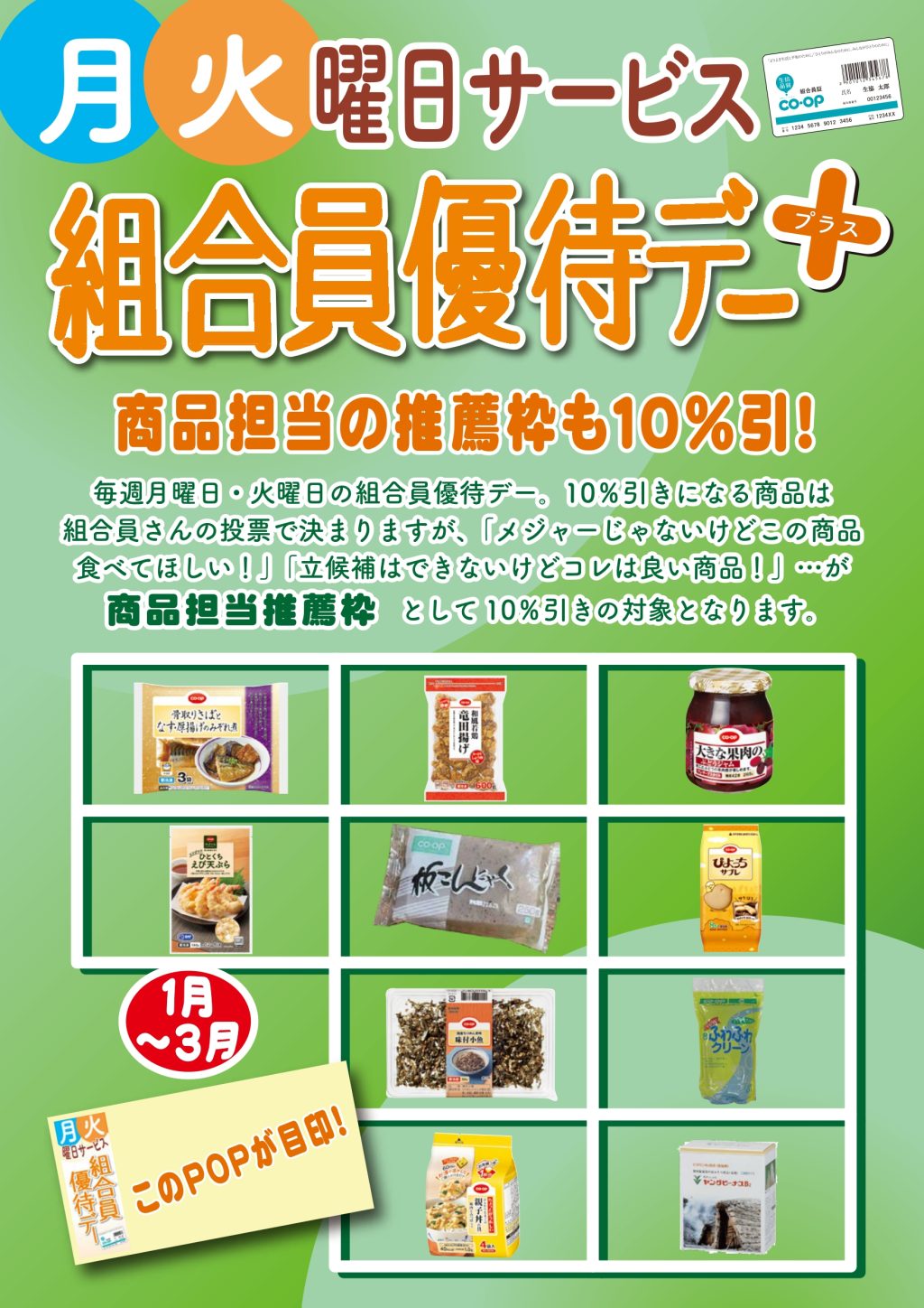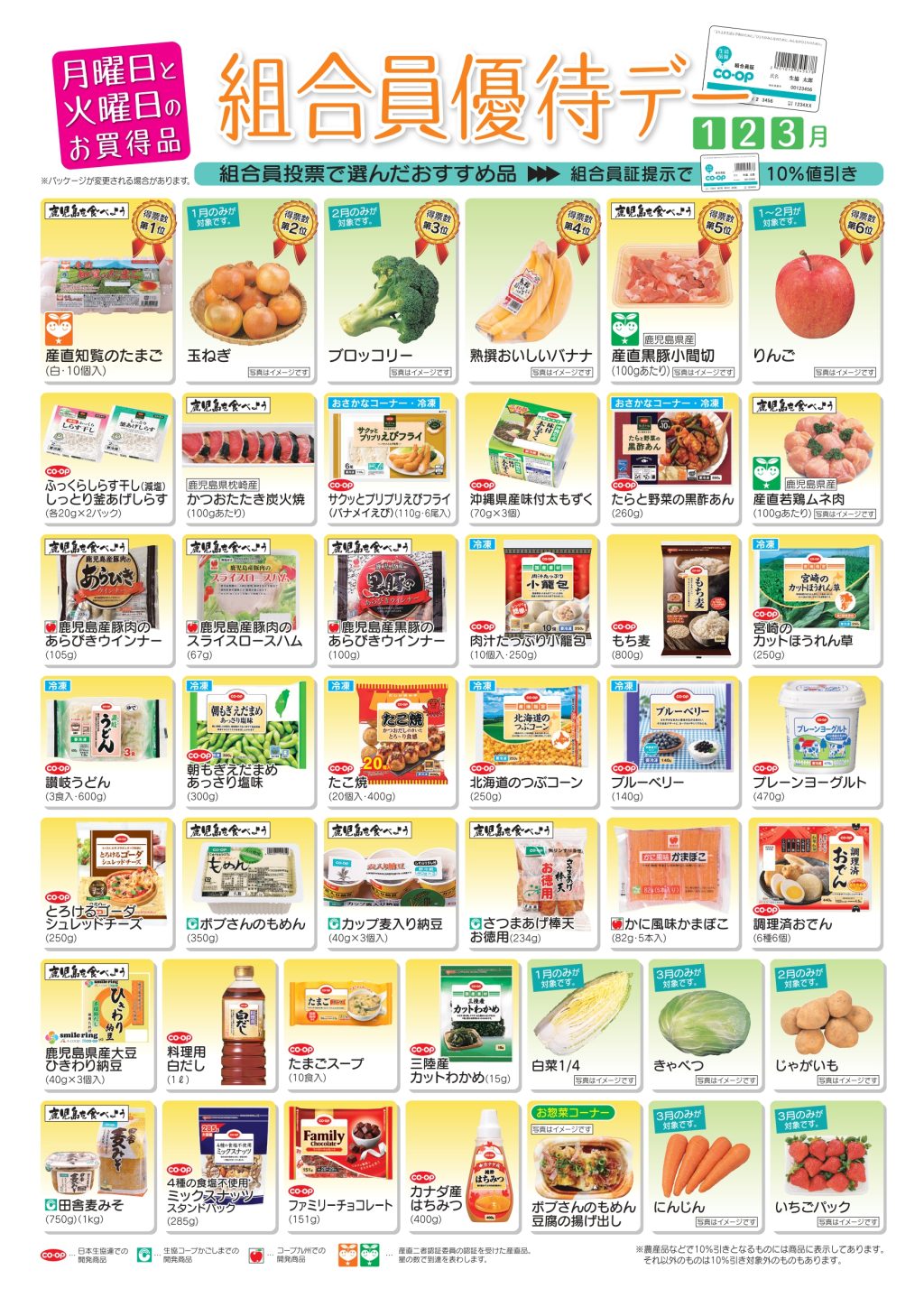 毎週月曜日・火曜日は、組合員カードを提示することで、特定の商品が表示価格から、レジで10%引きの組合員価格に。